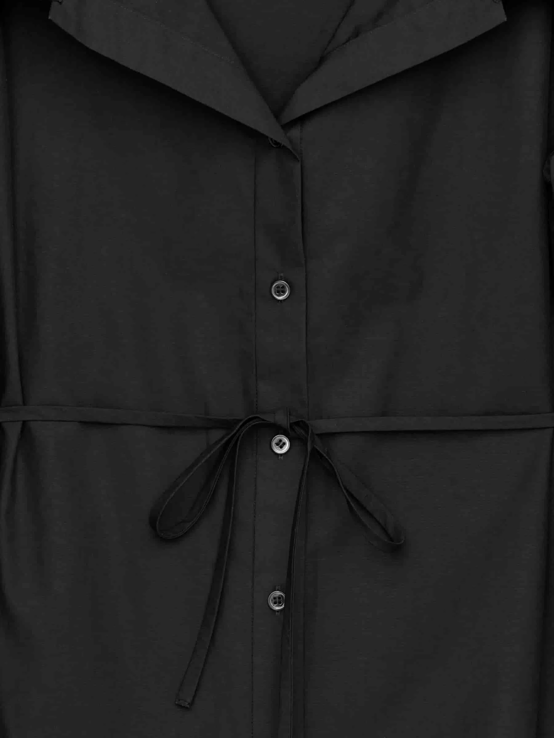 Camicetta con ampio colletto aperto, chiusura con bottoni e cinturino in vita. Spalla scesa e vestibilità regolare.