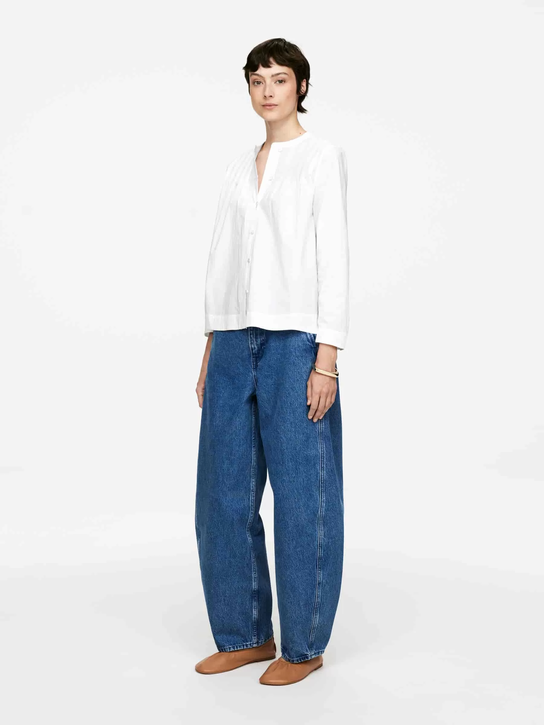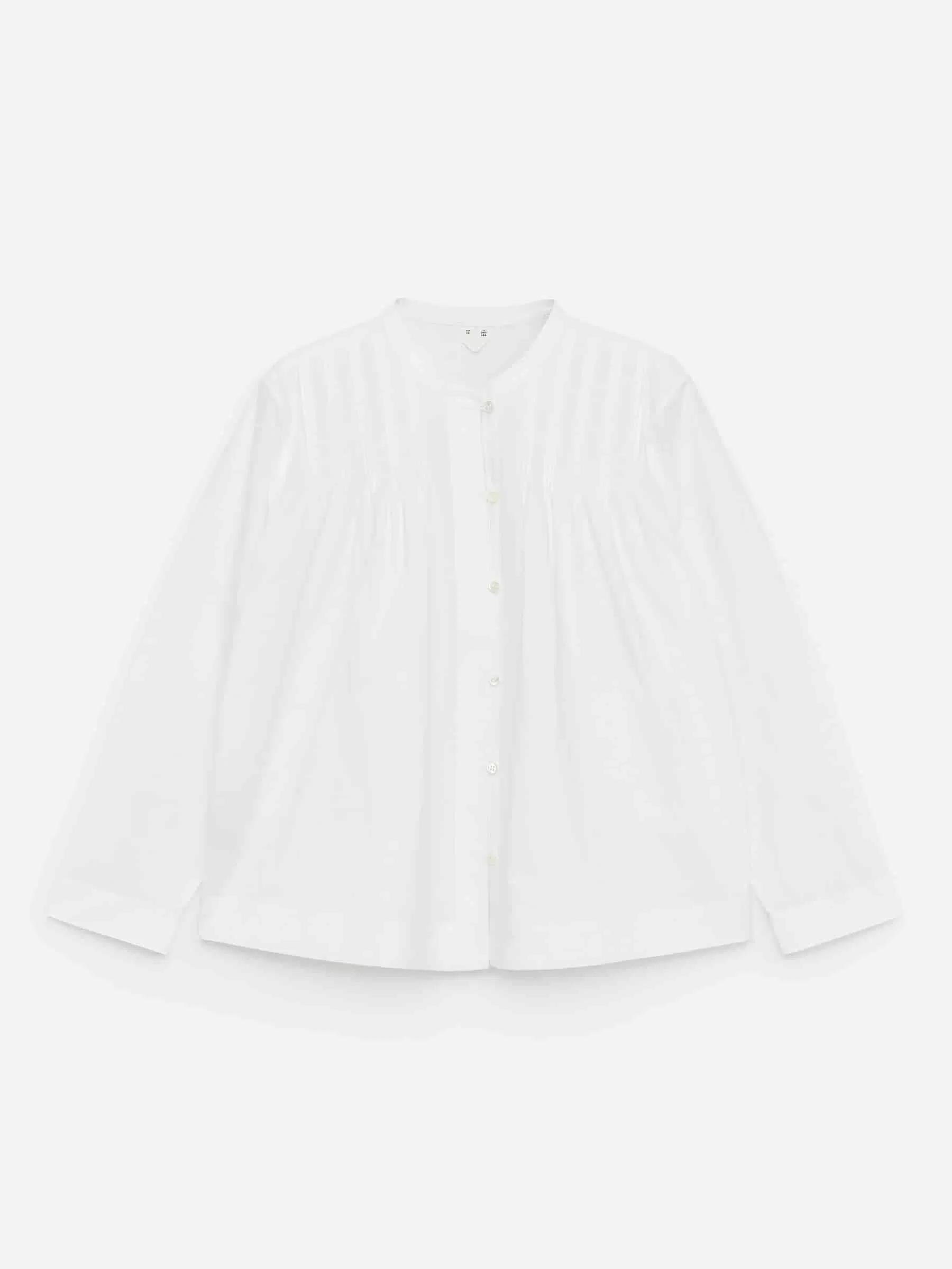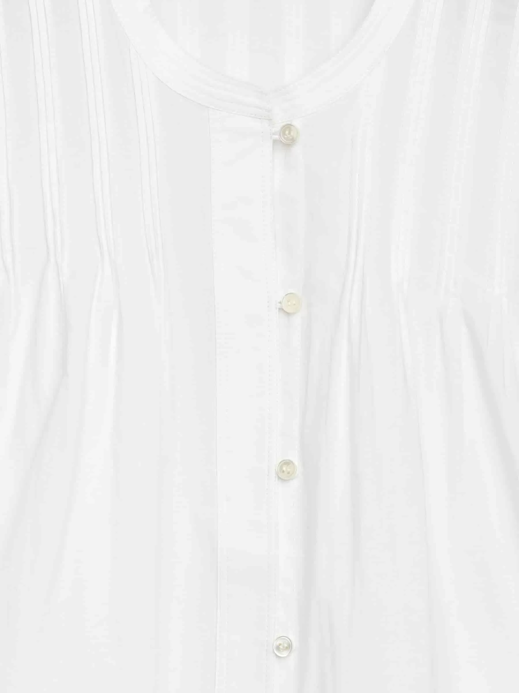 Camicetta in tessuto di cotone con nervature sul petto. Scollo arrotondato e abbottonatura frontale.