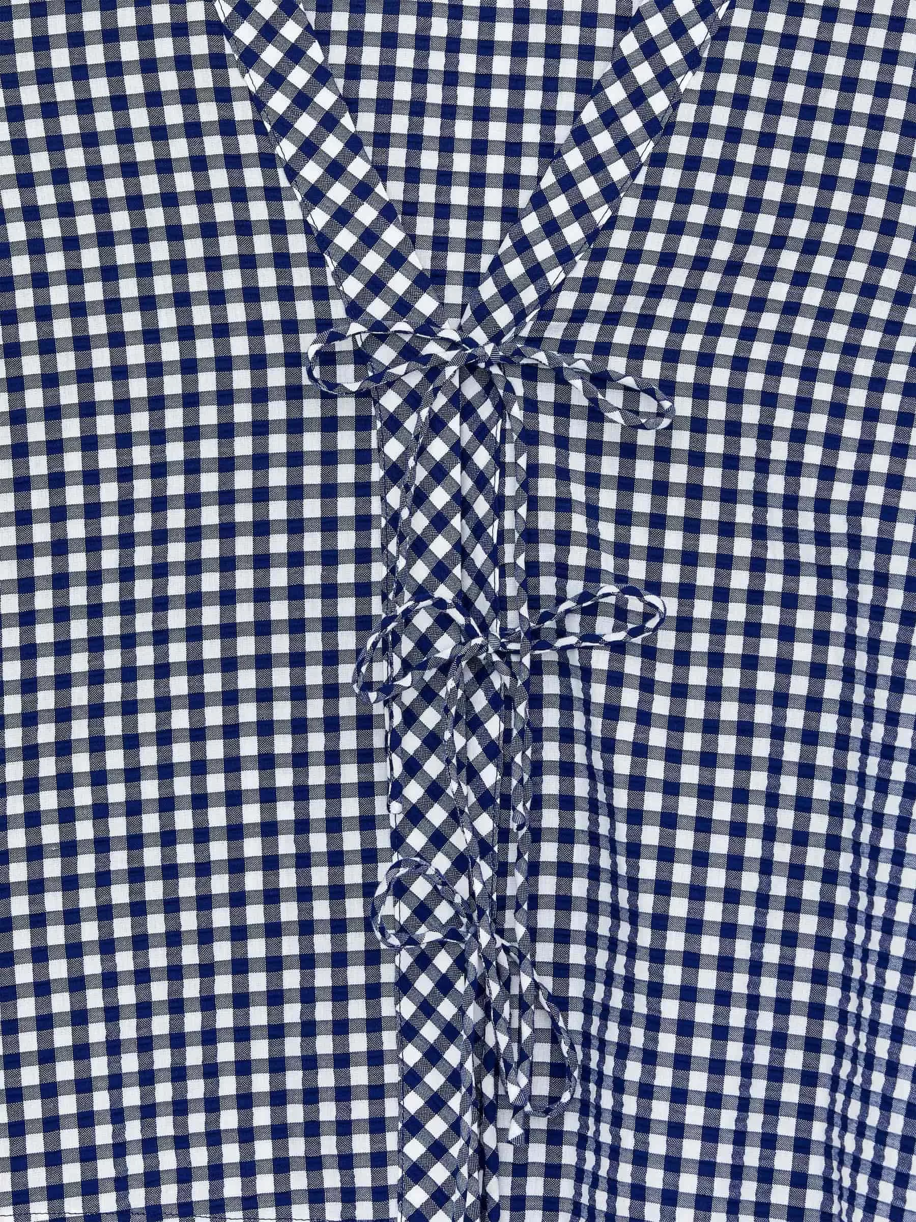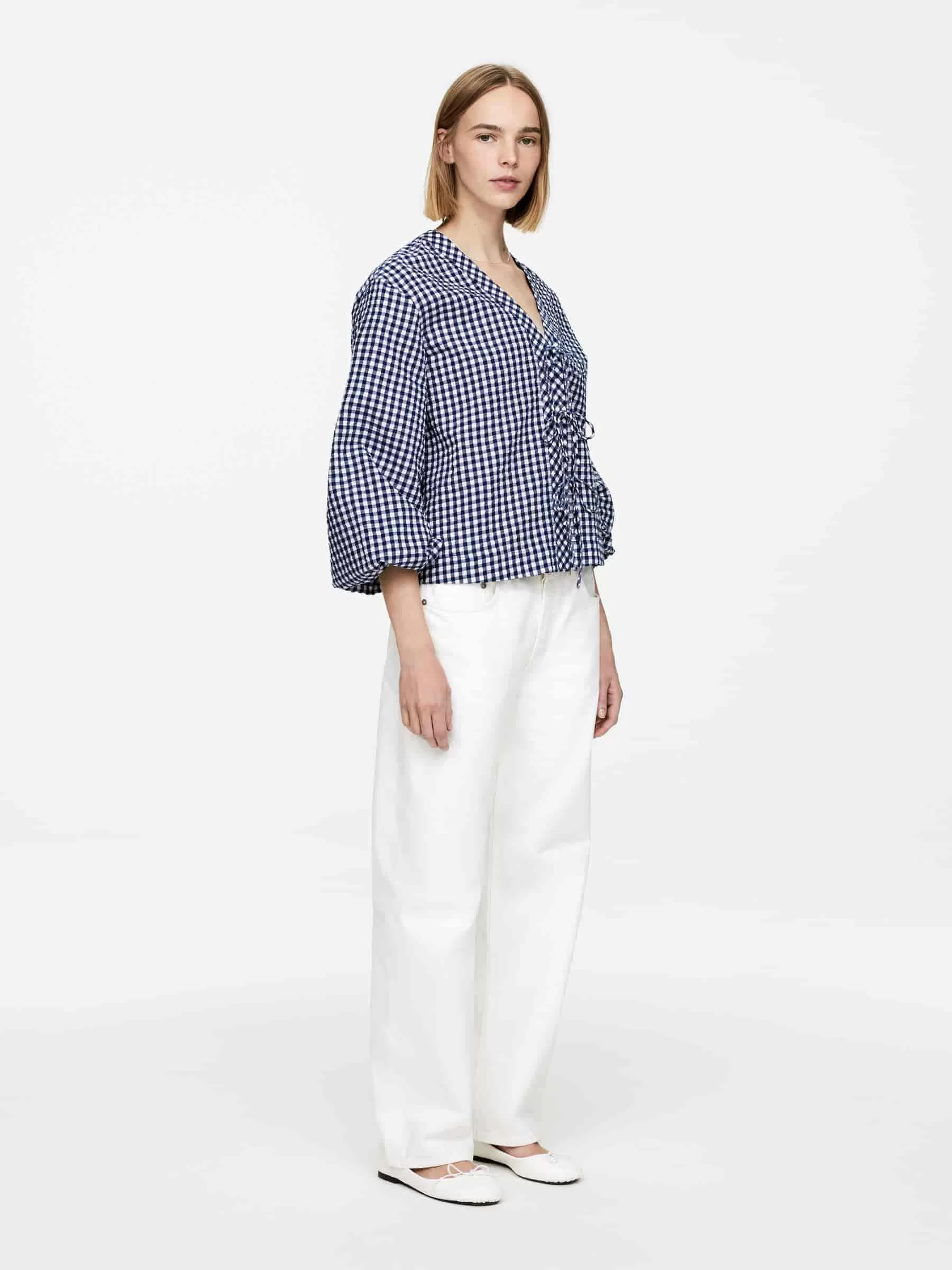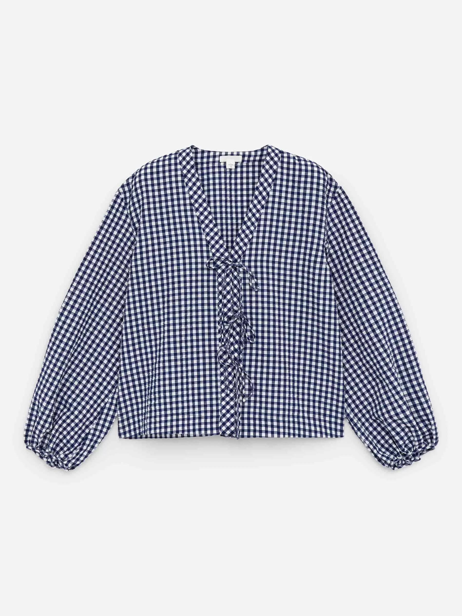 Blusa realizzata in tessuto seersucker con motivo a quadri a quadretti. Uno stile con scollo a V con maniche a sbuffo e fascette sul davanti. Vestibilità regolare.