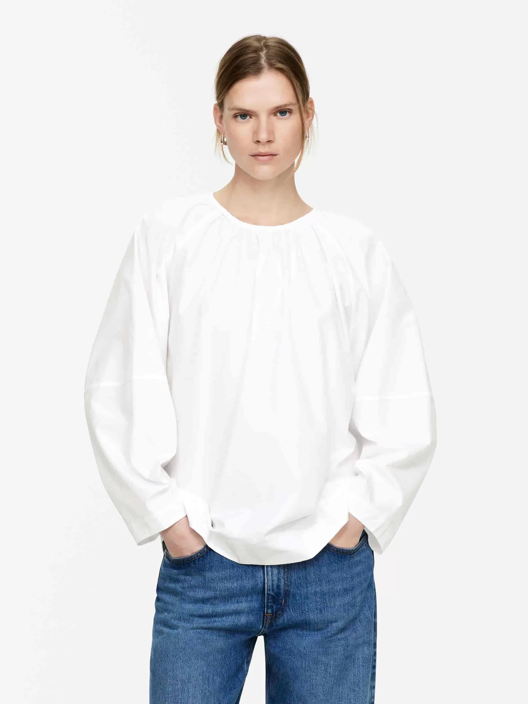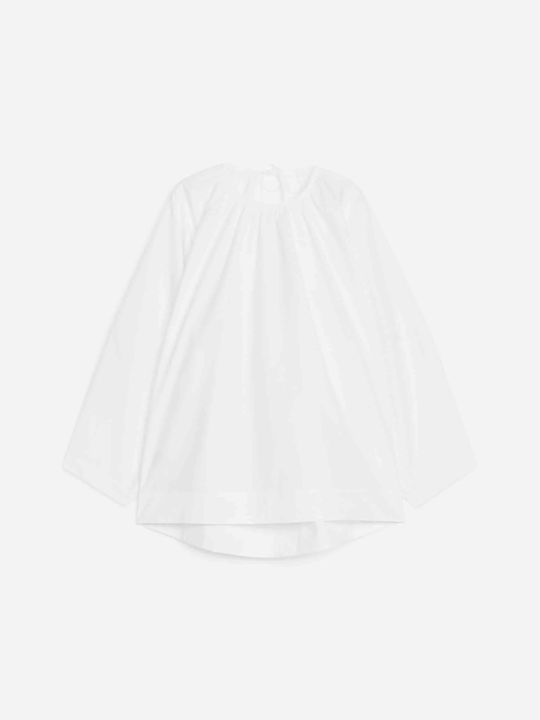 Camicetta in cotone con schiena scoperta, arricciature sul collo e laccetti al centro dietro. Vestibilità ampia.