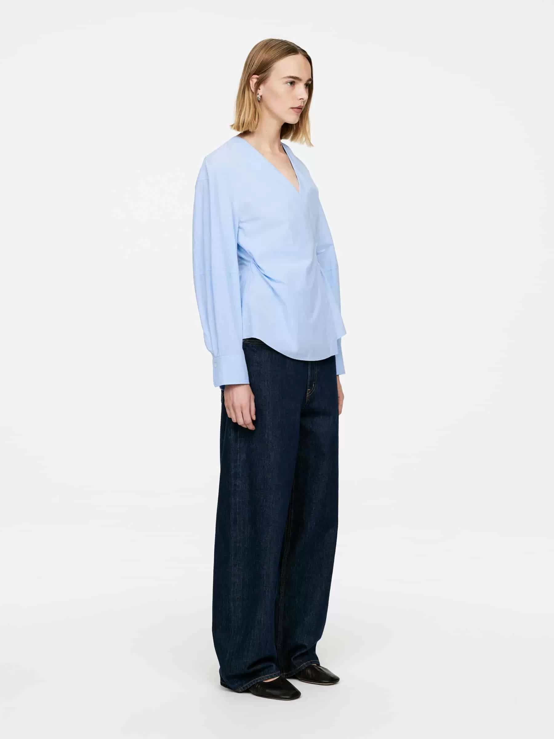Top avvolgente realizzato in cotone. Uno stile con scollo a V con spalle scese, maniche voluminose e allacciatura laterale. Vestibilità regolare.