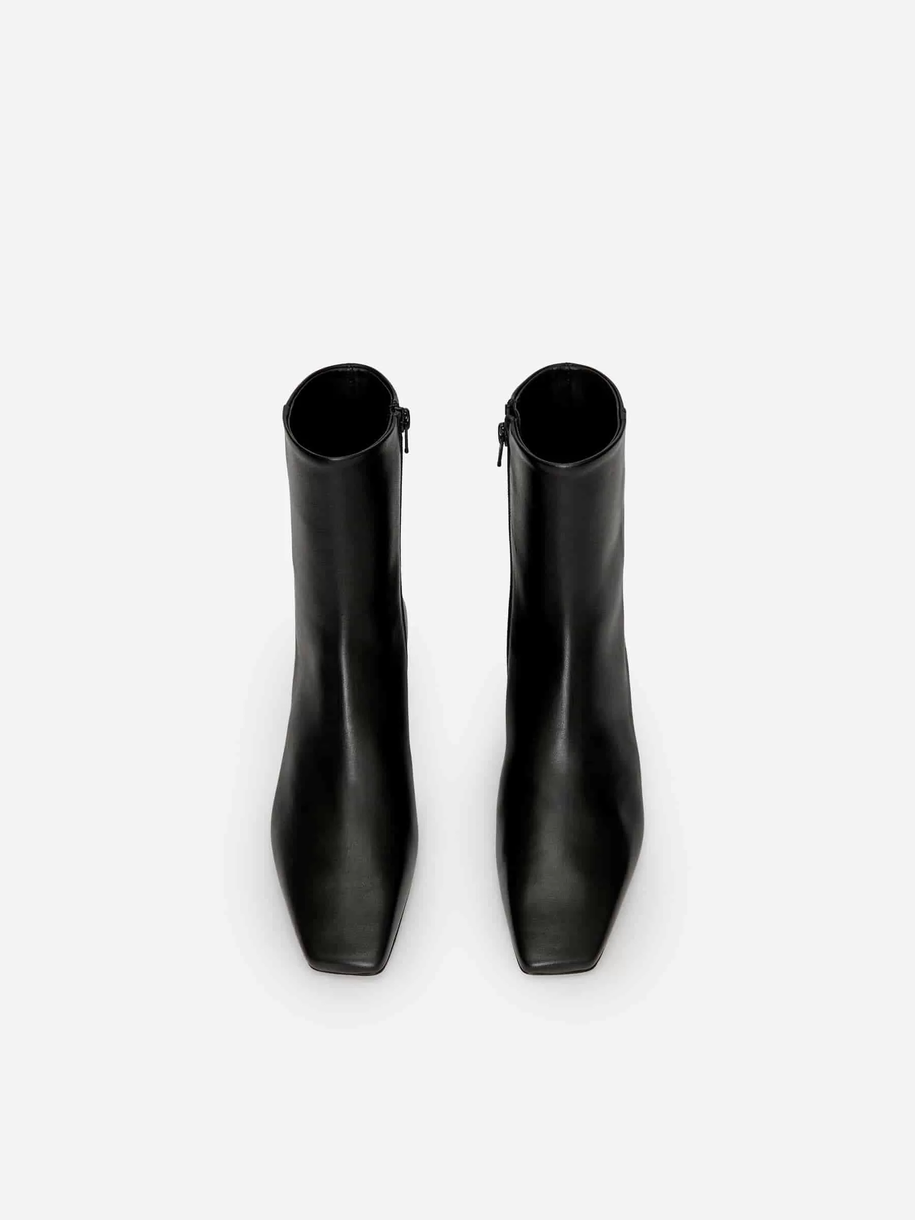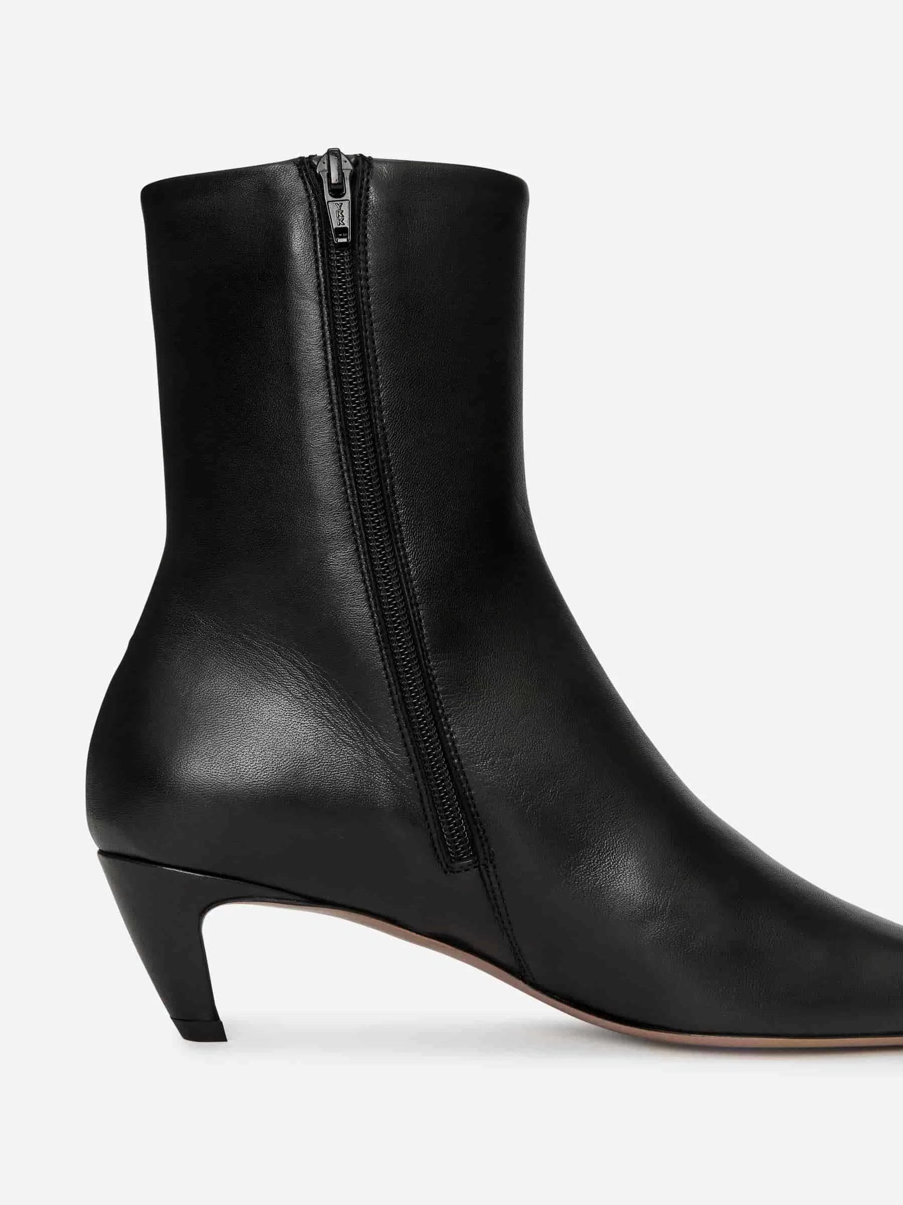 Stivali realizzati in pelle senza cromo. Uno stile dal taglio pulito con tacco leggermente arrotondato e punta quadrata. Chiusura con zip sul lato interno. Altezza tacco 5 cm.