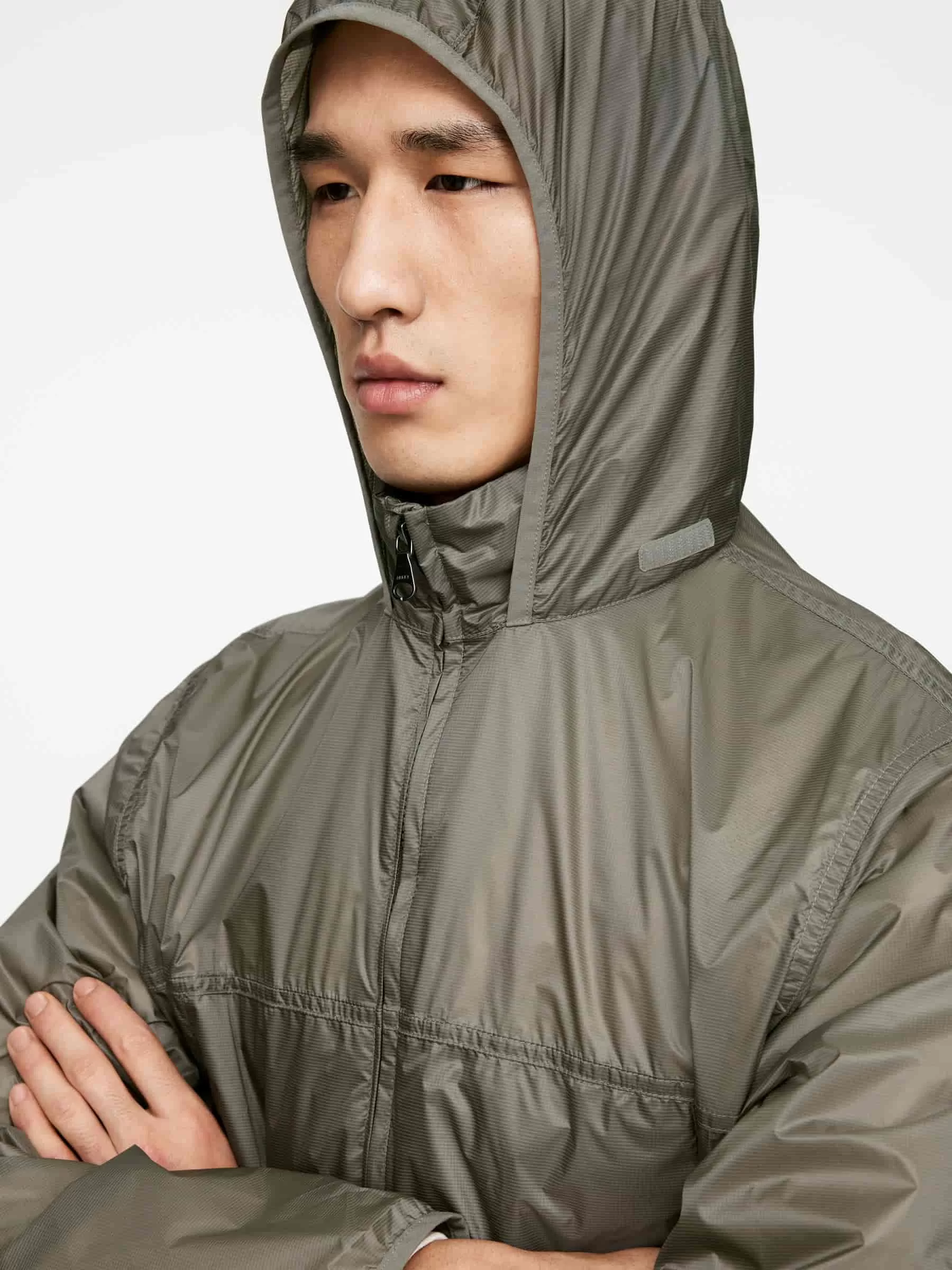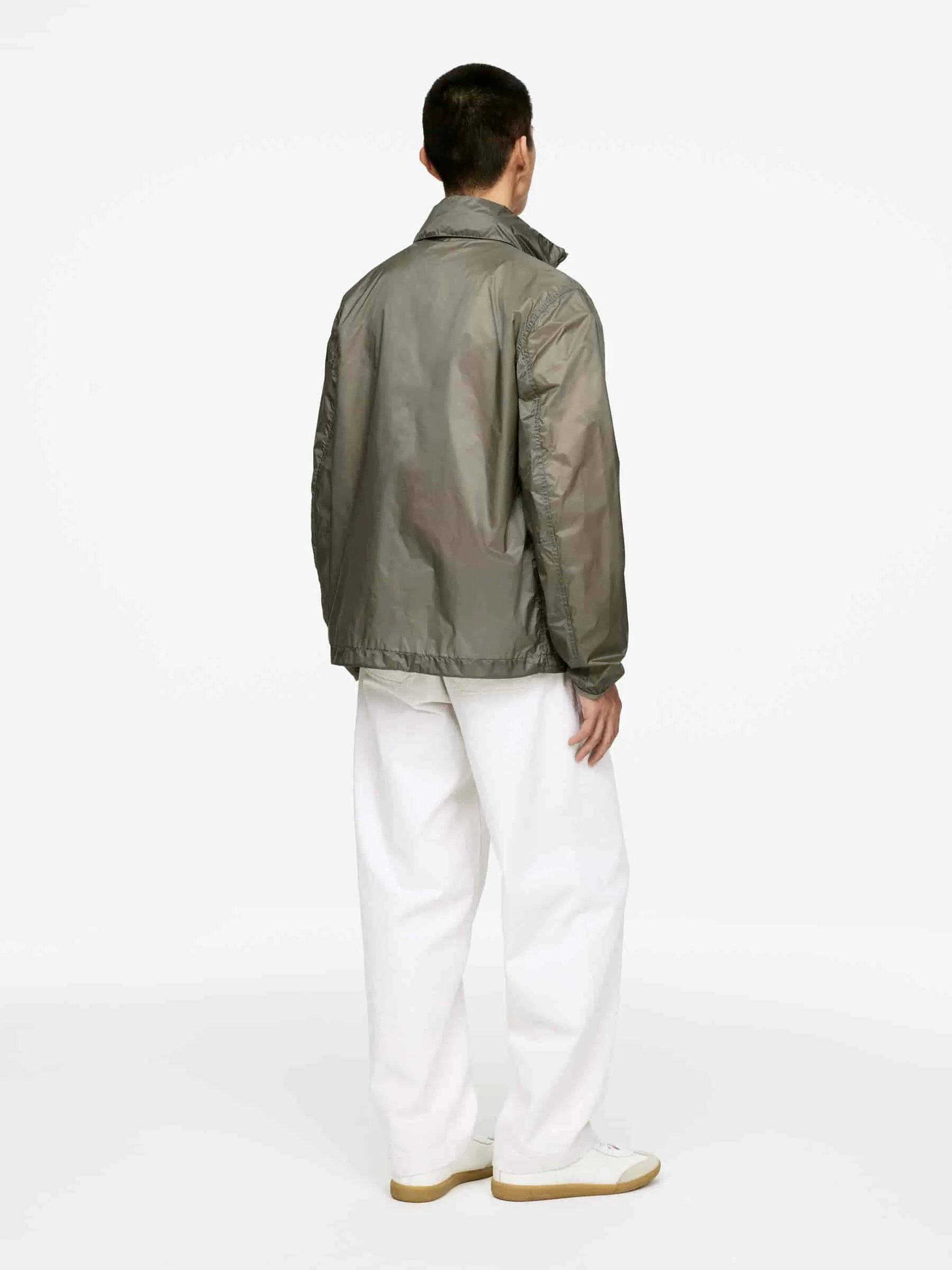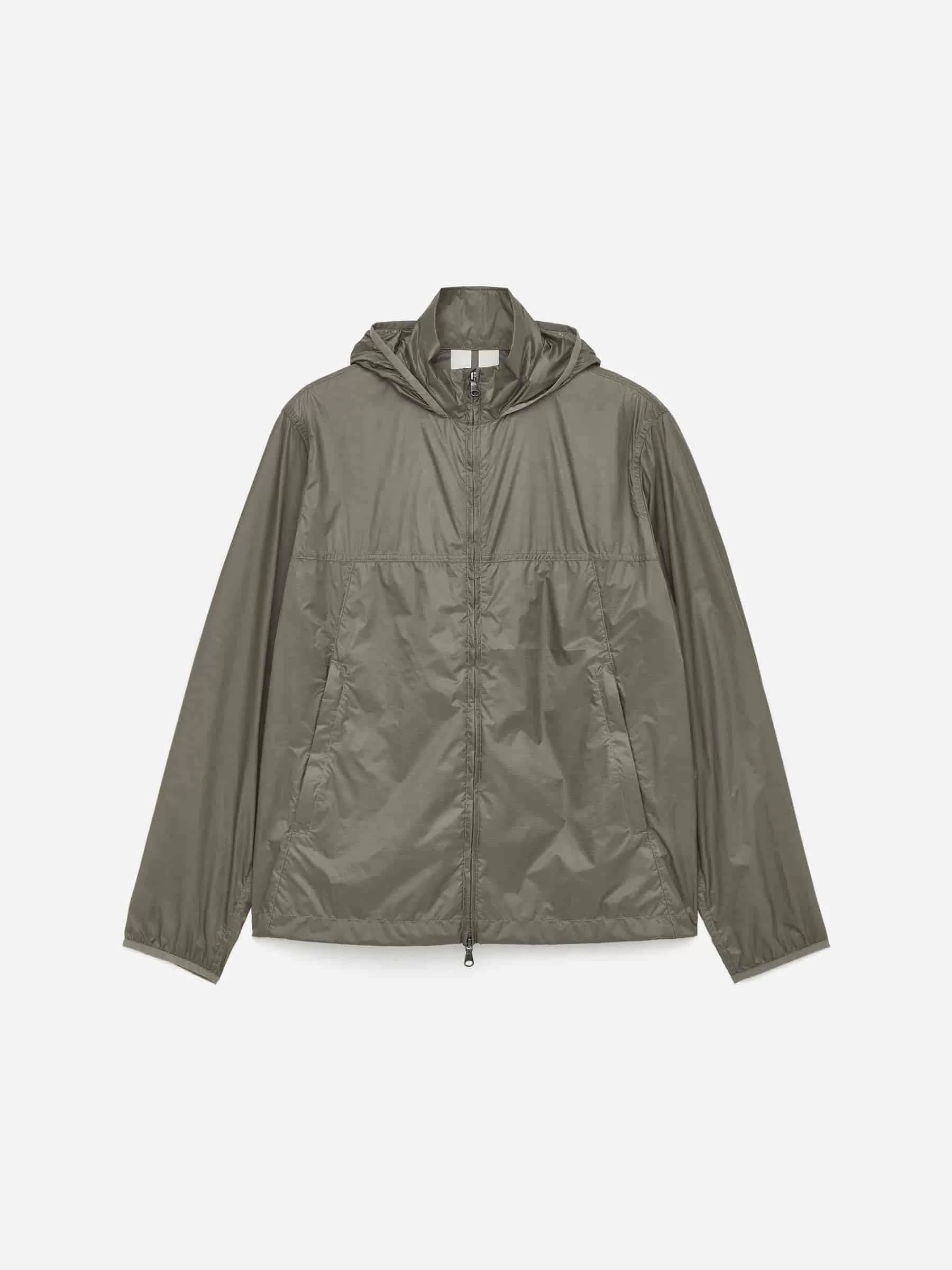 Giacca a vento in nylon con zip a doppio cursore davanti, tasche oblique con chiusura zip ed elastici sul fondo maniche. Nel colletto alto è nascosto il cappuccio. Elastici con regolatori sull’orlo inferiore.